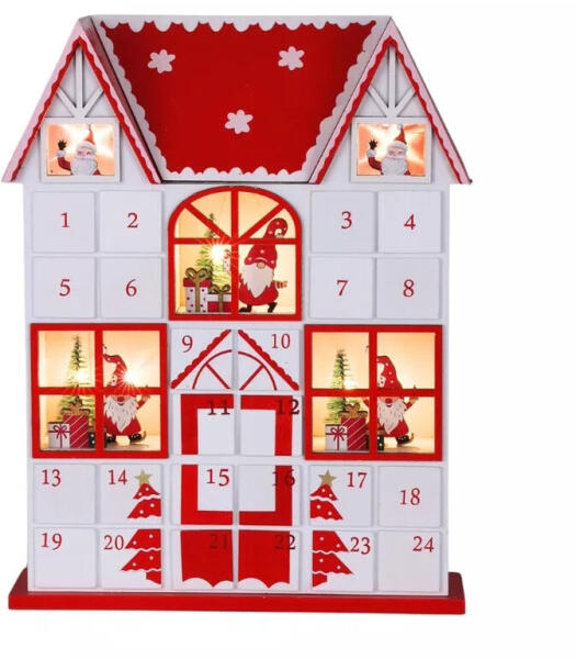 Az adventi naptár méretei 26 x 37 x 6 cm, fából készült és beépített LED világítása is van.