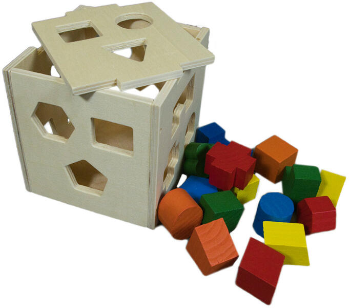 Fa ügyességi forma berakó, amely fejleszti a kisgyermek megfigyelő képességét, a színek és formák azonosítását, kézügyességét. Természetes alapanyagból fából készült. Előnye, hogy a fa dobozban könnyen tárolható.
