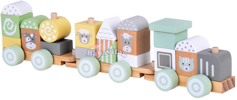 A fából készült vonat egy elbűvölő játék, amely minden gyermeknek örömet okoz, és bevezeti őket a kreatív játék világába. Különböző formájú színes blokkokból áll, amelyeket állatok, például tehén, birka, ló és cica képei díszítenek, ami még vonzóbbá teszi a játékot. A kockák szabadon mozgathatók, elhelyezhetők, építhetők, ami támogatja a gyermek kézügyességének, fantáziájának fejlődését.