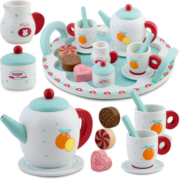 Fából készült játék teáskészlet Ricokidák: RK-869 ⭐ Finommotorika fejlesztése: A különféle elemeket tartalmazó teáskészlet az elrendezéshez és hordozáshoz serkenti a szem-kéz koordinációt és fejleszti a mozdulatok pontosságát. ⭐ Érzékszervi stimuláció: A teáskészlet elemeinek különböző formái és textúrái megmozgatják a látást és a tapintást, gazdag érzékszervi élményt kínálva gyermekének. ⭐ Montessori inspiráció: A Montessori-módszer ihlette készlet az önálló felfedezést és a cselekvés általi tanulást segíti elő, támogatja az aktív és tudatos tanulást. Főbb jellemzők: fából készült, biztonságos festékkel bevonva, szilárd, gondosan kidolgozott elemek, kiváló a finom motoros készségek fejlesztésére, kiterjedt készlet - végtelen szórakozás, pasztell, elegáns színek, a biztonságot az EN tanúsítványok garantálják. ⭐⭐⭐⭐⭐ Kiváló minőségű természetes fából készült játék. Az intenzív színek serkentik a gyermek látását, megkönnyítik a színek tanulását és támogatják a vizuális észlelés fejlődését. Ezenkívül a felhasznált biztonságos festékek és tartós fa garantálja, hogy a játék még a legfiatalabb felhasználók számára is biztonságos, és hosszú évekig szolgálni fog. Oktatás és szórakozás! A készlet kiváló minőségű fa elemeket tartalmaz, mint például kancsó, csészék, kanalak és tálalótálca. Csokoládét is tálalhatsz rá, ami hitelességet ad az egész jelenetnek, és gyermeked elegáns partikat rendezhet. A teáskészlet a tálcán kívül a következőkből áll: Tálaló tálca Kancsó Csésze x 2 Csorbóka Cukortartó Csokoládé x 3 kanál x 2 1 tányér és csészealj x 2 Tedd boldoggá gyermekedet! A készlet tartalma: Kancsó fedéllel Kanalak 2 db. Csésze csészealjjal 2 db. Lemez Csokoládé 3 db. Tálaló tálca